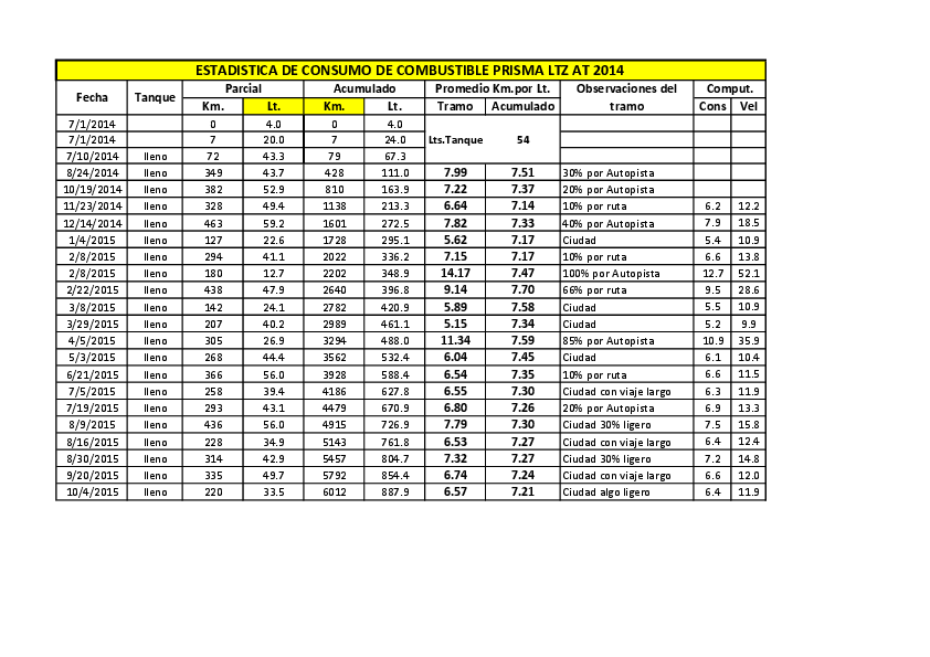 NO ME QUEJO DEL CONSUMO DE MI PRISMA: Hace casi 20 años que hago este trayecto todos los días y este es un consumo que, aun cuando parezca increíble por la diversidad de modelos y cilindradas, arrojaron siempre en forma parecida mis coches (Ford Aerostar AT, Vectra AT, Falcon 3.0 MT y Chevette MT). Cuando esté más cerca del vencimiento de la garantía, le pondré GNC, como mis anteriores coches.
