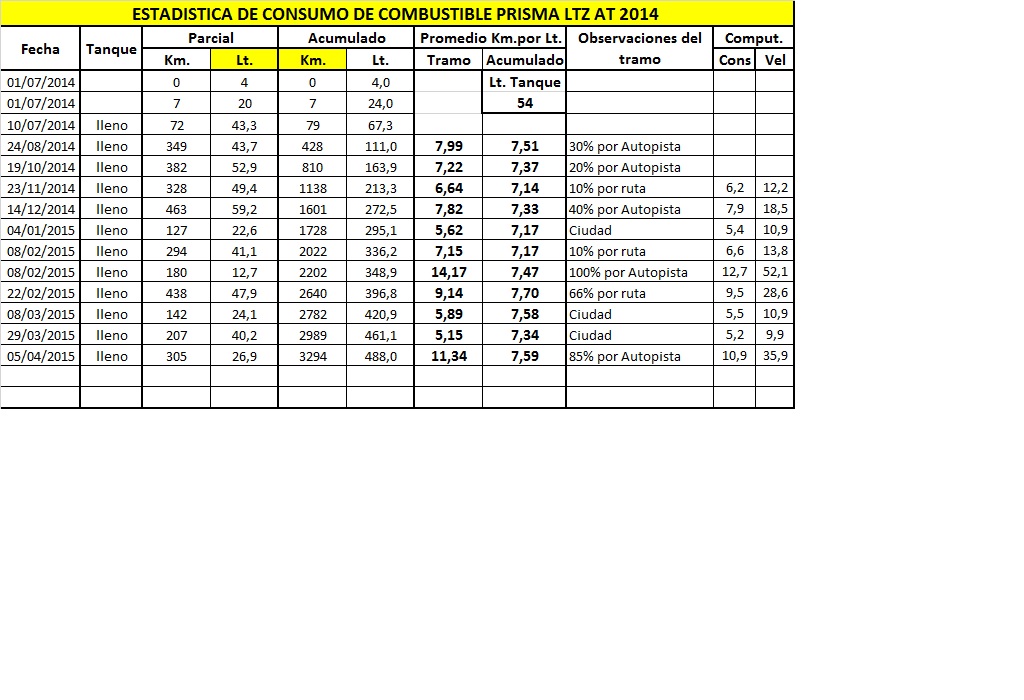 Prisma ltz at... 0 km, solo con 500km de uso me dio un promedio en la primer c*** con un uso 100% ciudad de 7,5km x litro.... me parece muchisimoooo para un auto chico. Lo voy a controlar mas y vere sino en el service de 10k.
