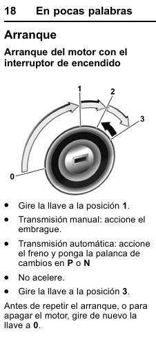 Entre las tantas cosas que uno se pone a hacer en la espera del coche nuevo, me topé con el manual. Leyendo cualquier otra cosa, veo que en la sección de arranque describe los pasos para arrancar el auto.