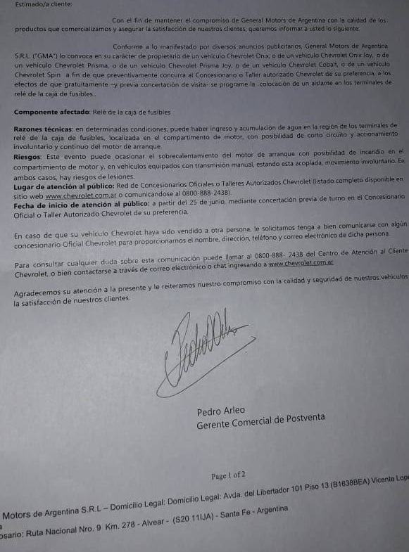 Hola Marcos. Te confirmo que no estas loco. Ayer cuando subi a mi Prisma me pasó exactamente lo mismo. Lo puse en marcha, estaba acomodando unas cosas y empecé a escuchar una vos y al principio no entendí de donde salía, pense que era la radio o una llamada del celu, pero no. Se escuchaba muy bajo, demasiado, el ruido del motor no dejaba escuchar lo que decía. Solo pude entender una parte que dijo "puede acercarse a su concesionario favorito" o algo así. A pesar de que apague el auto y lo volvi a encender, el mensaje no se repitió. Supongo que deben estar llamando a todos los usuarios involucrados en el recall, aunque el detalle es que yo ya lo lleve a hacer el service donde tambien le pusieron el "pegote" al rele. Es mas, me metí a la pagina de chevrolet y mi chasis ya no figura en el pedido de recall.marcoscaceres escribió:¿A alguno de ustedes les pasó que el auto les hable?