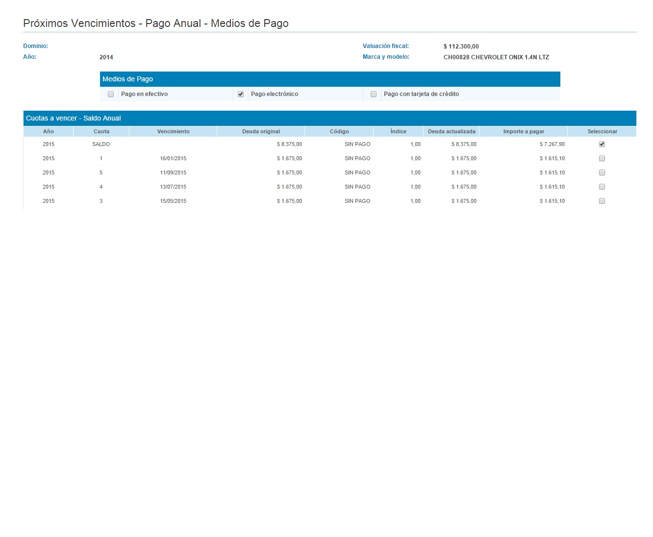Buenas gente, me fijé y por el onix 2013 (fines de noviembre) me vino $970 o 4800 pago total. No mucha diferencia que el año pasado. Saludos y feliz año!!!!!