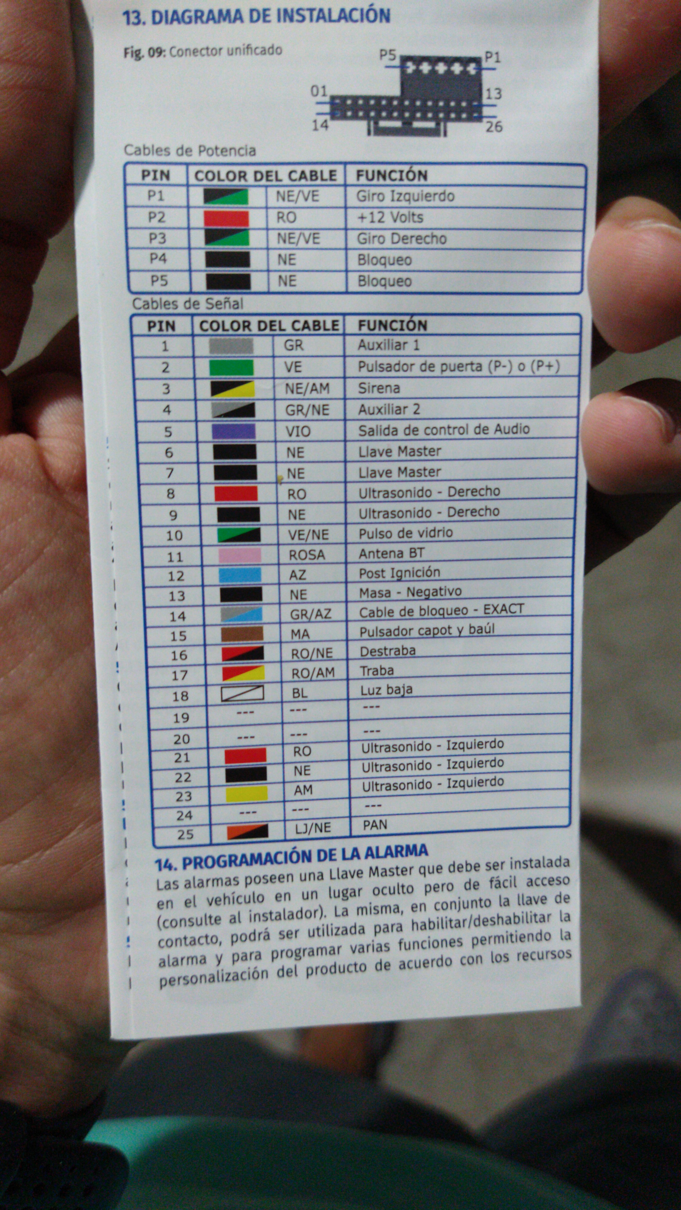 La alarma tiene dos cables rojo/negro destraba - rojo/amarillo traba, tiran una señal negativa. Por lo que investigado, la manera de vincularla seria por medio de la ficha de acción cierra/abre. Tendríamos, me incluyo, que extraerla y fijarnos con un tester o punta logica por donde tira la señal al modulo de cierre centralizado y si es negativa.