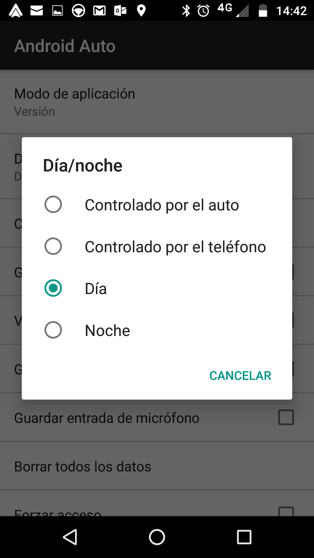 7.- dentro de esta existen 4 opciones, controlado por el auto, controlado por el telefono, dia y noche, en mi caso lo deje fijo en dia y no importa la hora que sea la pantalla no pasa a modo nocturno.