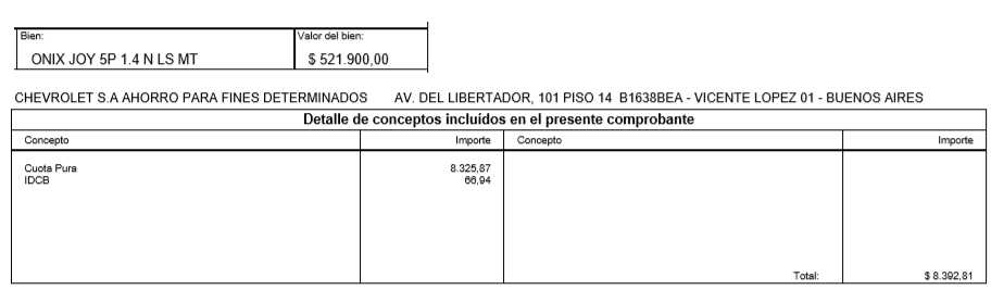 Hola gente les cuento lo que pasó en mi caso: estoy pagando un joy modelo 2019 y siempre estoy contándoles las costilla controló todo y de hace dos meses o sea el mes pasado y este que entro al sistema (la página de Chevrolet donde puedo seguir mi plan) quiero imprimir la boleta para pagar y no me deja. Bueno me comunico con la concesionaria que está en mi ciudad y le explico lo que me pasa, así que muy amable mente y de inmediato me mandan un archivo con la factura, bien este aquí que la factura que ellos me manda tiene una diferencia de como $4.000 menos de lo que yo calculo que tengo que pagar, bueno pago eso lo que ellos me mandan, buen este mes lo mismo no puedo imprimir la boleta de la paguina y les pido a la concesionaria o casualidad de nuevo menos plata pero en el sistema me figura que tengo que pagar $15.000 y me mandan la boleta con un monto de $8.000 maso.... llamo mi señora ayer a CHEVROLET Bs As y le consulta lo que estaba pasando la respuesta es algo así.