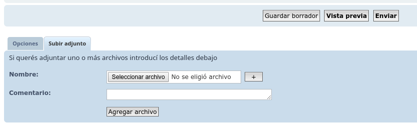 Abajo del cuadro de respuesta, después de los botones de Borrador, vista previa y Enviar, hay dos pestañas, una de ellas es 'Subir adjunto'